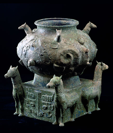 簋[guǐ]为食器。此件铜簋敞口,鼓腹下收,腹下有长方形座,座内有悬铃舌之纽,铃舌已失。肩部浮雕四匹昂首伏卧的小马,前足后曲,后足伸直,两马臀部相对,马首是另铸焊接的,卧马之间饰卷曲的双身龙纹。腹部饰卷眉凸眼的凶兽面,兽面之间有长垂冠,勾利嘴,长尾巴的凤鸟4只,器座较长的两边铸立马4匹,每两匹一组,头向相反,昂首竖耳、头小、颈长、身短、蹄粗、尾长下垂,尾毛根根可辩。座身两长边浮雕马身,马高马长均为16厘米。器座较短两边饰兽面纹。