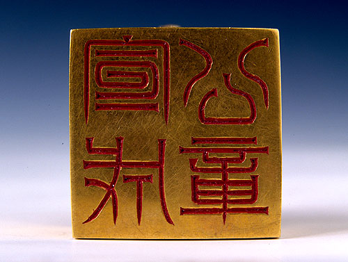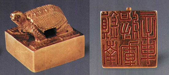龟首高昂,龟背拱起,尾下垂,四肢粗壮,腹下镂空。篆体阴刻“宣成公章”四字,是墓主的爵位。同墓还出土了其它两枚印章,一为双面铜印,刻有“刘弘”、“刘和季”,为墓主的姓名及字;一为“镇南将军章”金印,为墓主的官职。据《晋书•刘弘传》记载:“刘弘,字和季”,“以勋德兼茂,封宣成公”,“太安中,张昌作乱……以弘代为镇南将军,都督荆州诸军事”。刘弘,西晋时先后拜荆州刺史和宁朔、车骑、镇南建军,并以“勋德兼茂” 封宣成公。这两枚金印的出土,既证实了史籍所记的可靠性,也印证了晋代“四镇”将军位从公爵,皆假金章的制度,具有较高的史料价值。