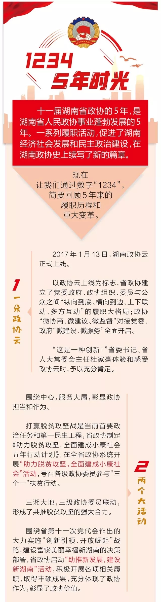 十一届湖南省政协的5年,是湖南省人民政协事业蓬勃发展的5年。一系列履职活动,促进了湖南经济社会发展和民主政治建设,在湖南政协史上续写了新的篇章。现在让我们通过数字“1234”简要回顾5年来的履职历程和重大变革。