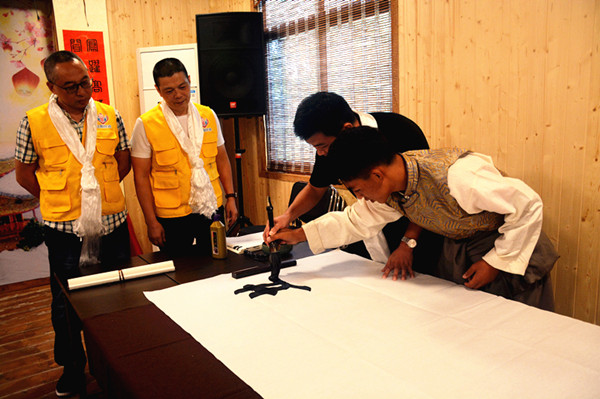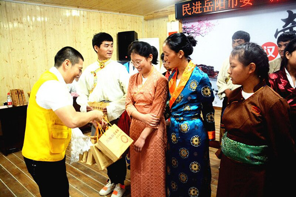 “咚咚锵、咚咚锵、乓”,节目在市委机关干部的三句半中开始。民进读书书会员陈丽蓉老师的独唱《珠穆朗玛》紧随其后。结对的藏族学生相继表演了歌曲《回到故乡》、朗诵《岳阳楼记》。在学生表演的同时,结对会员周朝辉与民进志愿者吴志军与孩子们一起练习书法,还将汉藏三幅书法作品赠送给岳阳市一中。