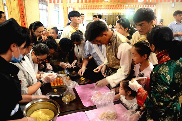 节目表演完之后,成立于2015年,主要经营各类纯手工中西式糕点的“MaMa·杯子蛋糕”私家烘焙工作室的志愿者,用带来的食材,从和面、包馅、压模、烘烤、刷蛋清,手把手教西藏班的孩子们做手工月饼。新鲜的月饼刚一出烤箱,藏族孩子们就送到了结对的汉族阿爸阿妈的手上。