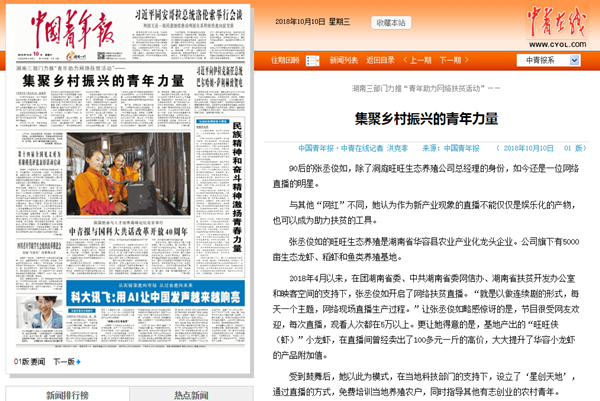 10月10日,岳阳民进会员张丞俊如利用新兴媒体创业扶贫的故事被中国青年报头版头条报道。