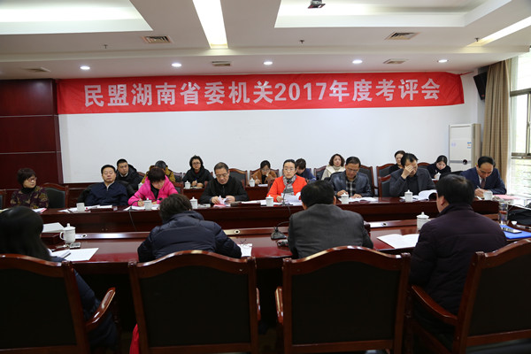 按会议议程安排,民盟湖南省委专职副主委胡颖首先宣读了《民盟省委机关2017年度考核工作实施方案》,盟省委机关厅级领导进行了述职,各处室负责人代表本处室分别就一年来工作进行了口头述职,其他工作人员进行了书面述职,并按规定,对全体机关干部职工和各处室工作进行了民主测评,共评出5名先进个人。