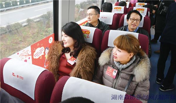 42名省政协港澳委员乘坐大巴,径直来到长沙磁浮快线黄花机场站体验磁浮快线的运行。随着快线启动,平稳加速,20分钟的时间里,透过车窗,长沙大建设、大发展的场景在眼前一一掠过,委员们兴趣浓厚,畅谈湖南发展,气氛热烈。